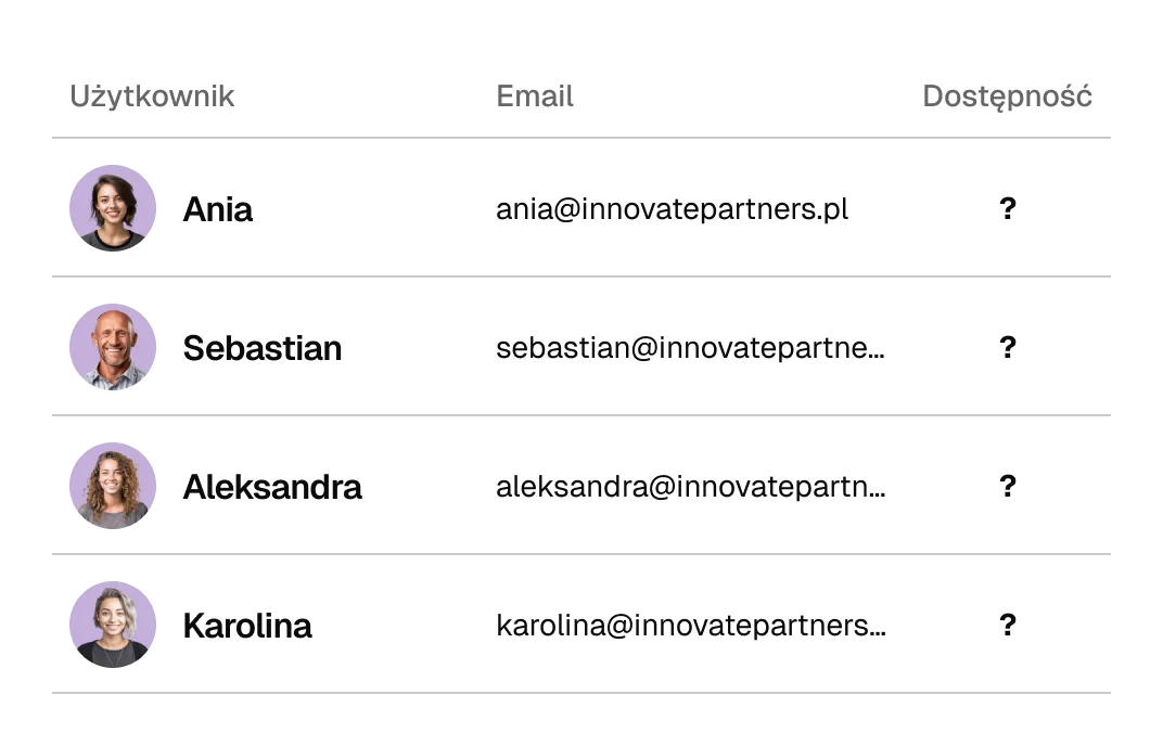 Nie ma czytelnej formy prezentacji dostępności zespołu. Jira i Slack się nie sprawdza.